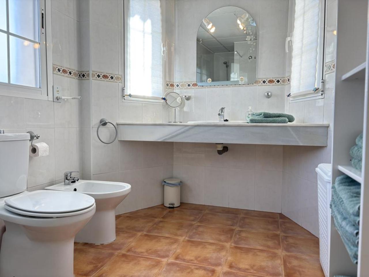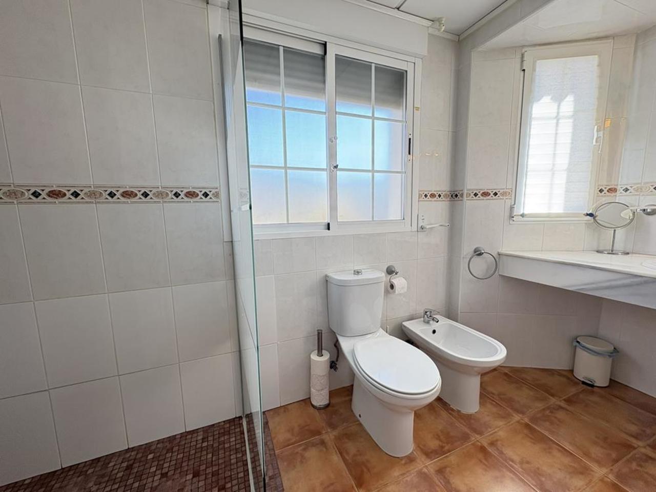 Depuis le salon, de grandes portes coulissantes s’ouvrent sur une terrasse couverte, idéale pour se détendre tout en profitant des vues incroyables. L’espace extérieur est un véritable point fort de la maison, avec une piscine privée, un espace de détente et un jardin luxuriant et mature qui offre à la fois beauté et intimité. Au rez-de-chaussée, on trouve également des toilettes pour les invités, pour plus de commodité.